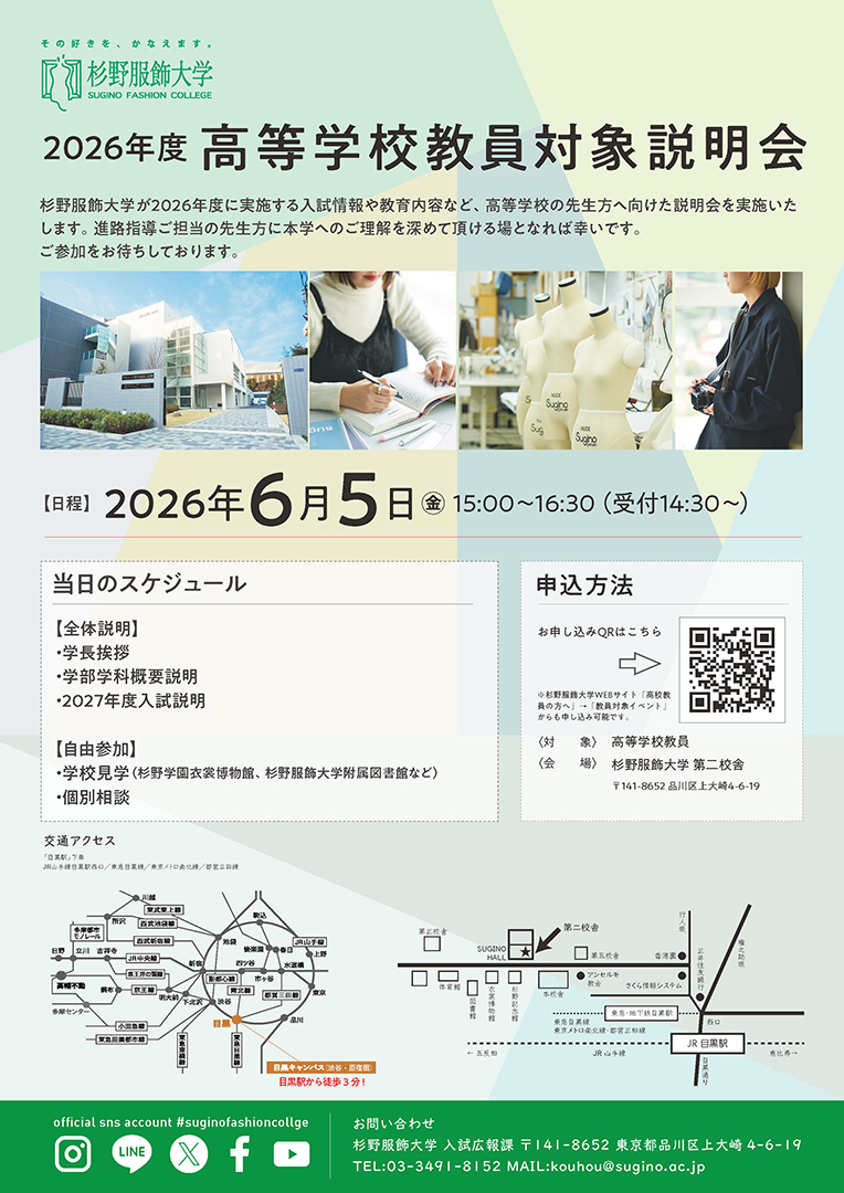 杉野服飾大学が2026年度に実施する入試情報や教育内容など、高等学校の先生方へ向けた説明会です。進路指導ご担当の先生方に本学へのご理解を深めて頂ける場となれば幸いです。