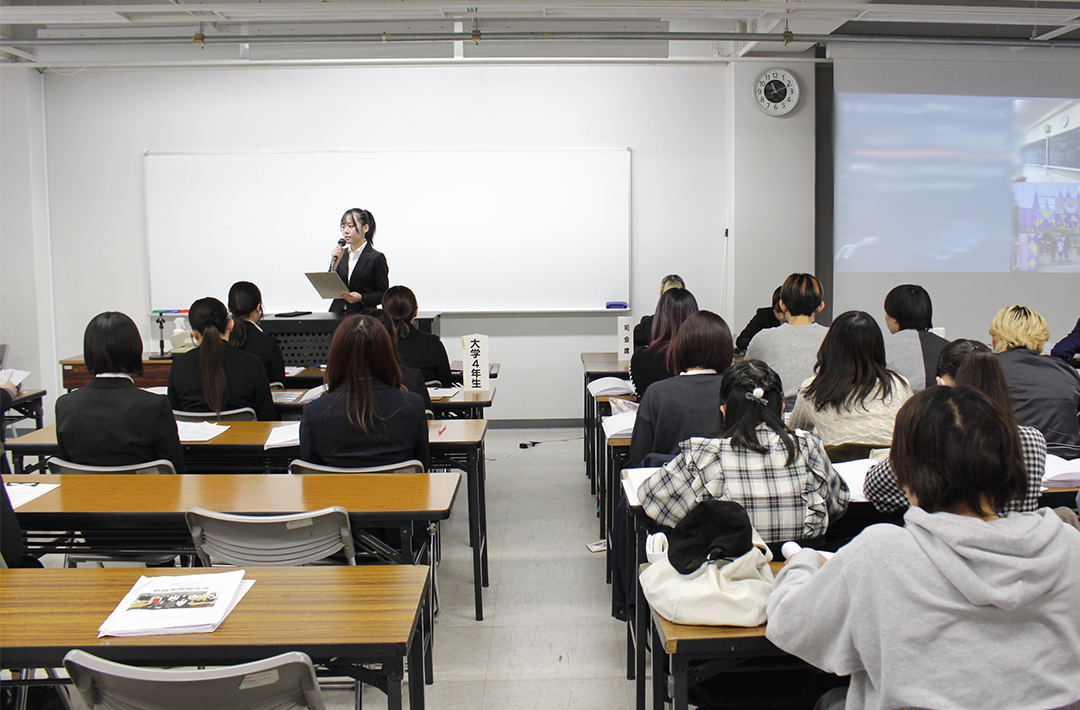 教職課程には、家庭科教員養成のための充実したカリキュラムが用意されています。1・2年次は理論的観点に立った授業が中心となり、3年次には学生たちが教員役や生徒役になって実施する「模擬授業」など、実践的な学修を導入しています。4年次には中学校・高等学校で実施される「実地教育実習」に向けての指導が計画的に行われ、実習終了後は「教育実習報告会」が開催されます。
