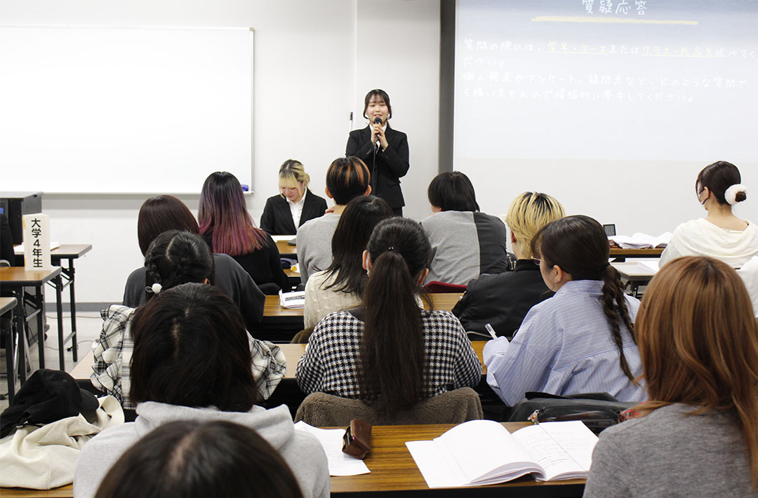 2025年11月29日(土)に、杉野服飾大学教職課程履修者14名による「令和7年度 教育実習報告会」がおこなわれました。大学で学んだことを生かし、中学校や高等学校へ約3週間の実地教育実習に出向き、実際に教師の業務を体験した4年生。実習校の様子から、実施を通しての成果点や反省点、教職課程を履修する後輩へのアドバイスなど、4年間の教職課程履修の集大成となる発表でした。